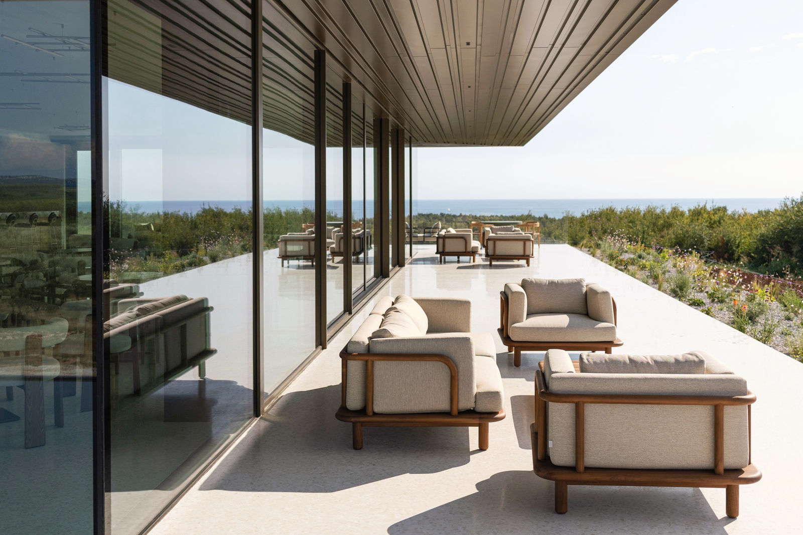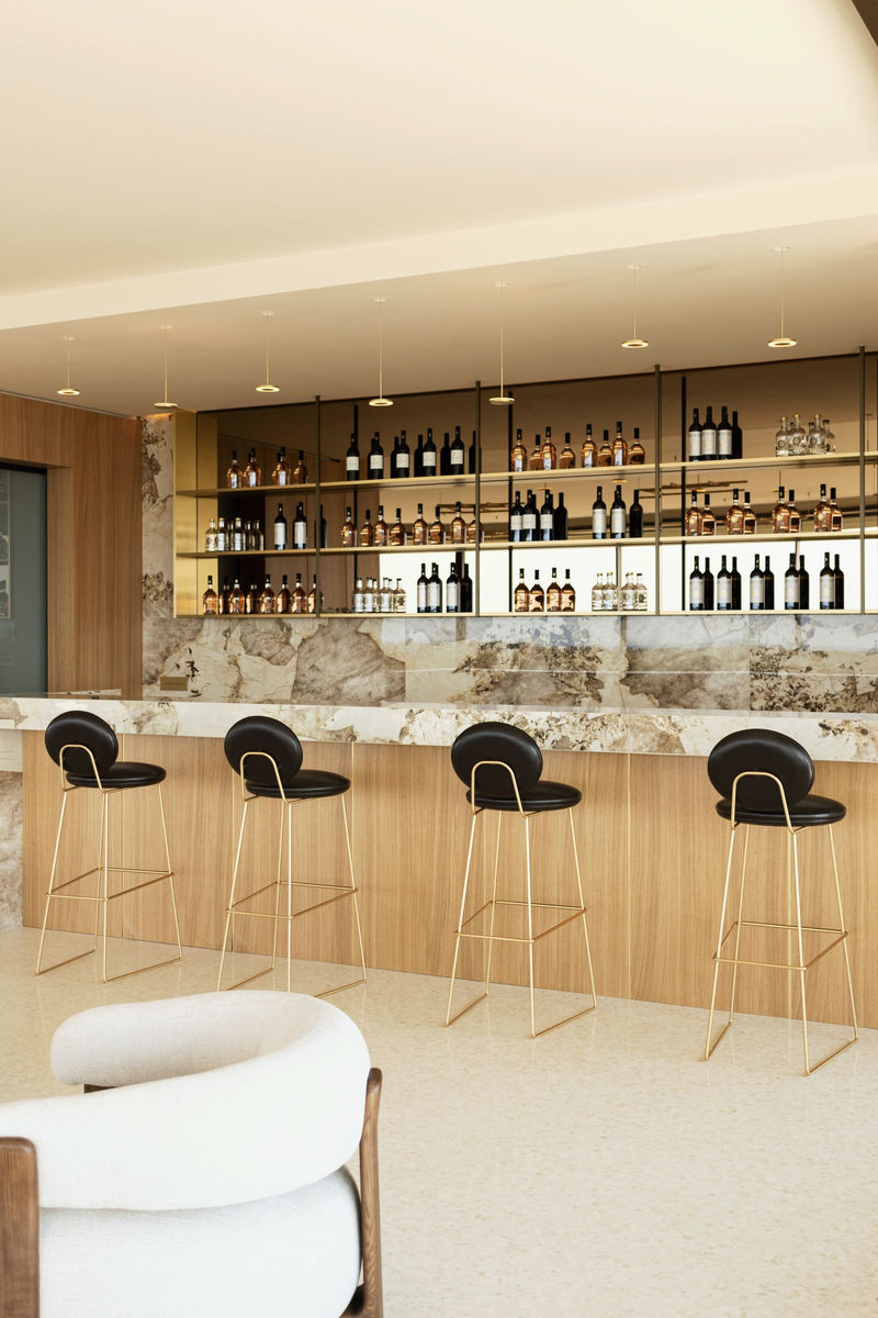 The furniture is curated to play with contrast. Bold Baxter furniture pieces introduce sculptural presence, balanced by lighter wooden chairs and softer elements to create harmony between strength and serenity, echoing the vineyards outside — robust yet elegant, grounded yet graceful