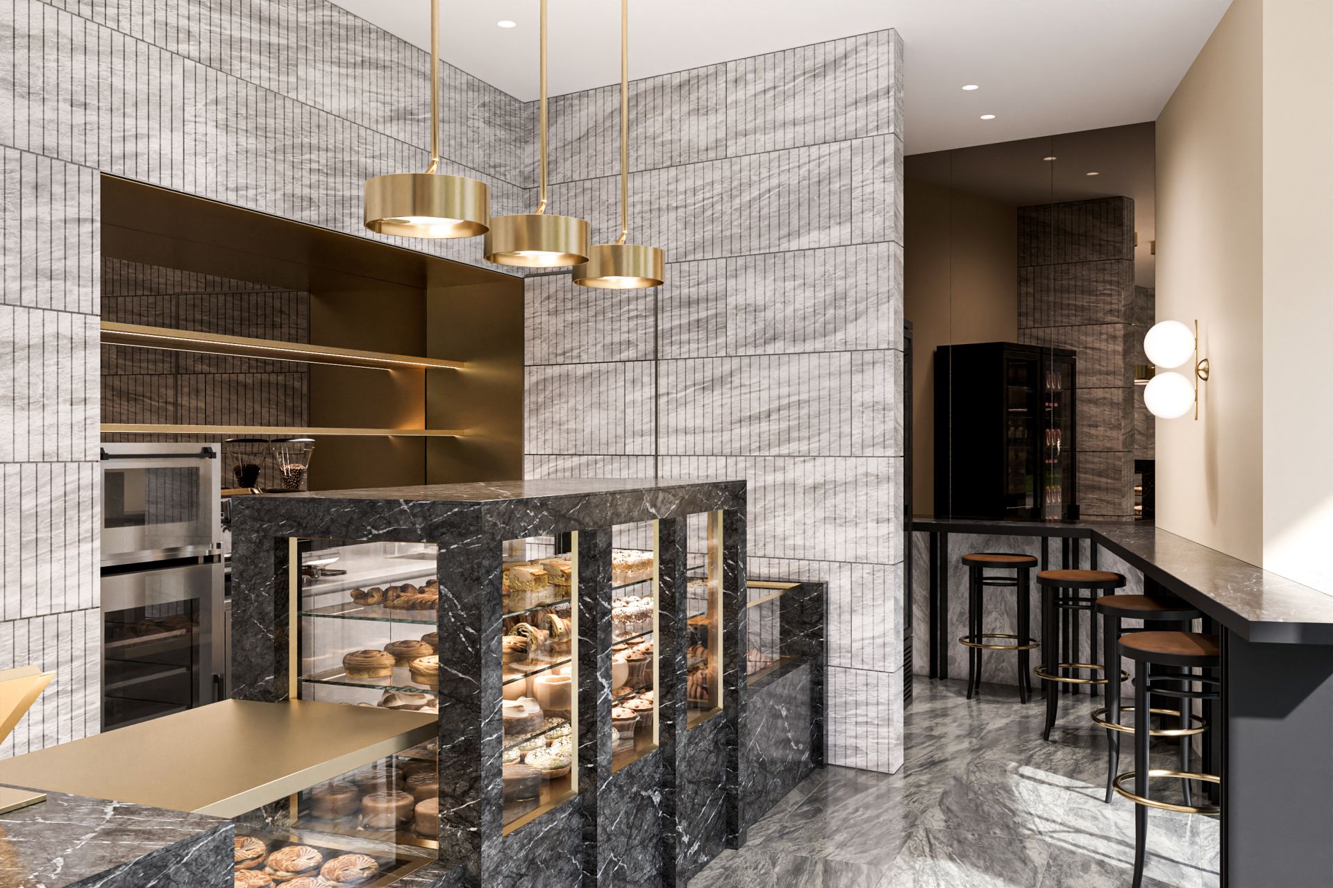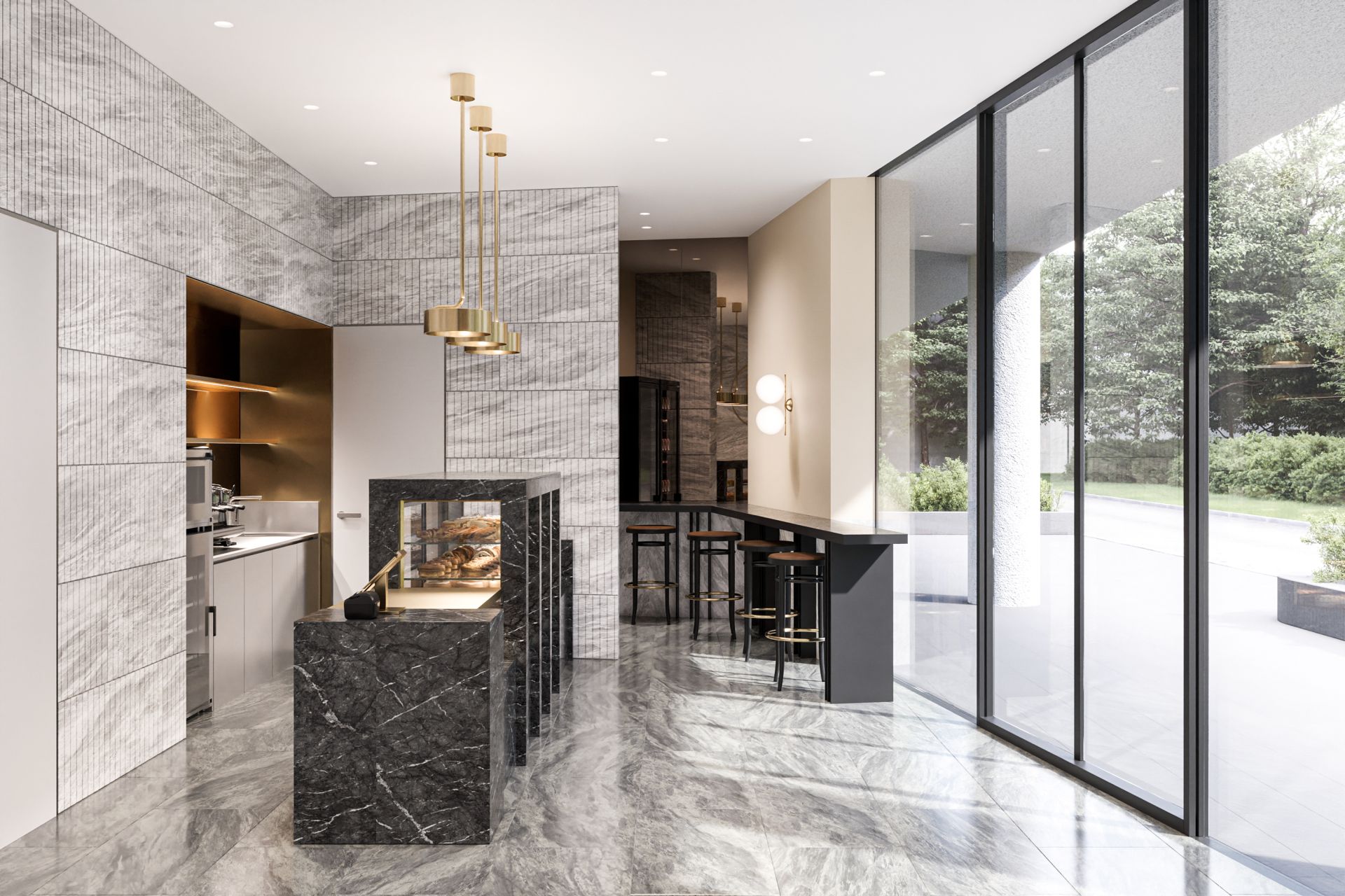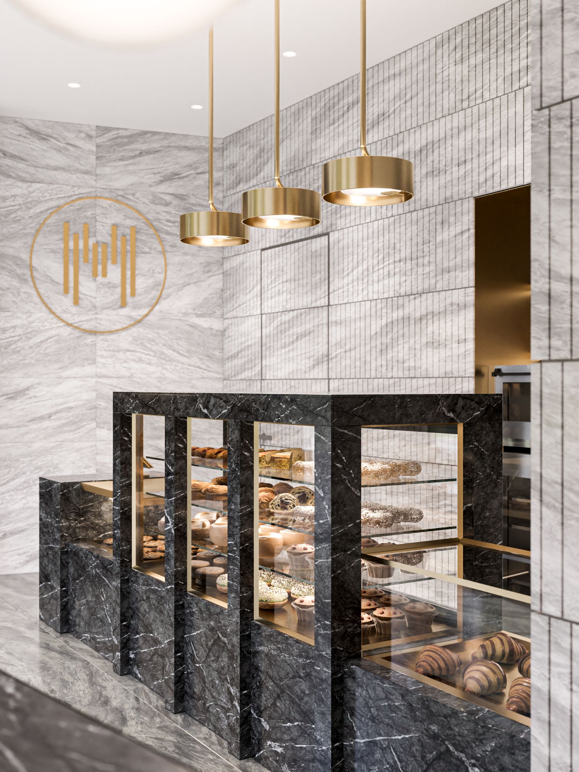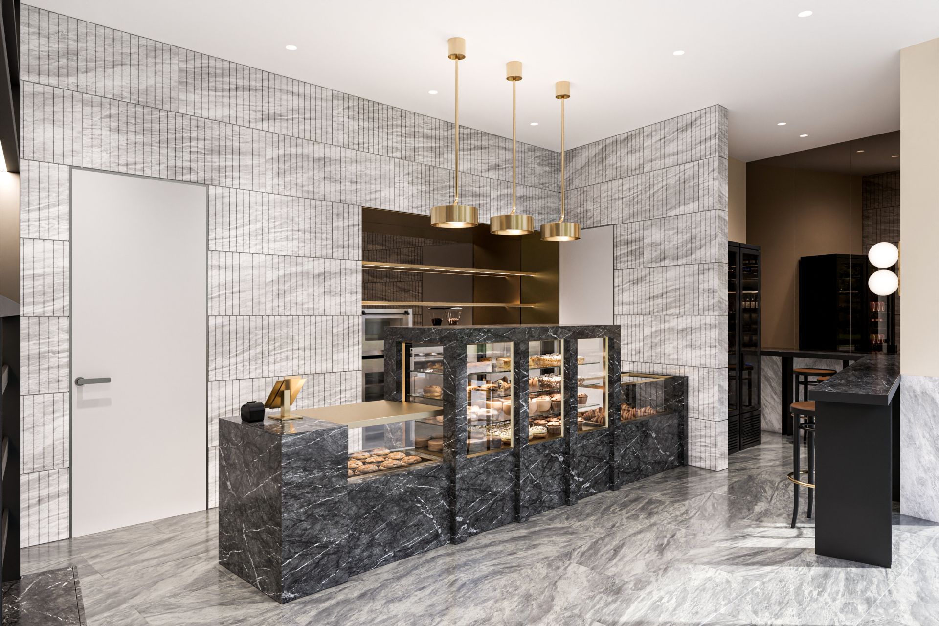 The interior of Montana Bakery unfolds as a narrative of timeless sophistication and modern precision. Bardiglio Grey Marble, with its refined veining and rich tones, forms the foundation of the space, adding depth and character. This is complemented by dark and grey marble ceramics, brass accents, and reflective glass surfaces, creating an interplay of light, texture, and form. Inspired by the vertical lines of the building’s facade, geometric patterns echo throughout the interior, subtly tying the bakery to its architectural surroundings. To maintain a seamless aesthetic, discreetly integrated doors lead to the preparation area, where fresh, homemade creations come to life—reinforcing the bakery’s commitment to quality and craftsmanship.