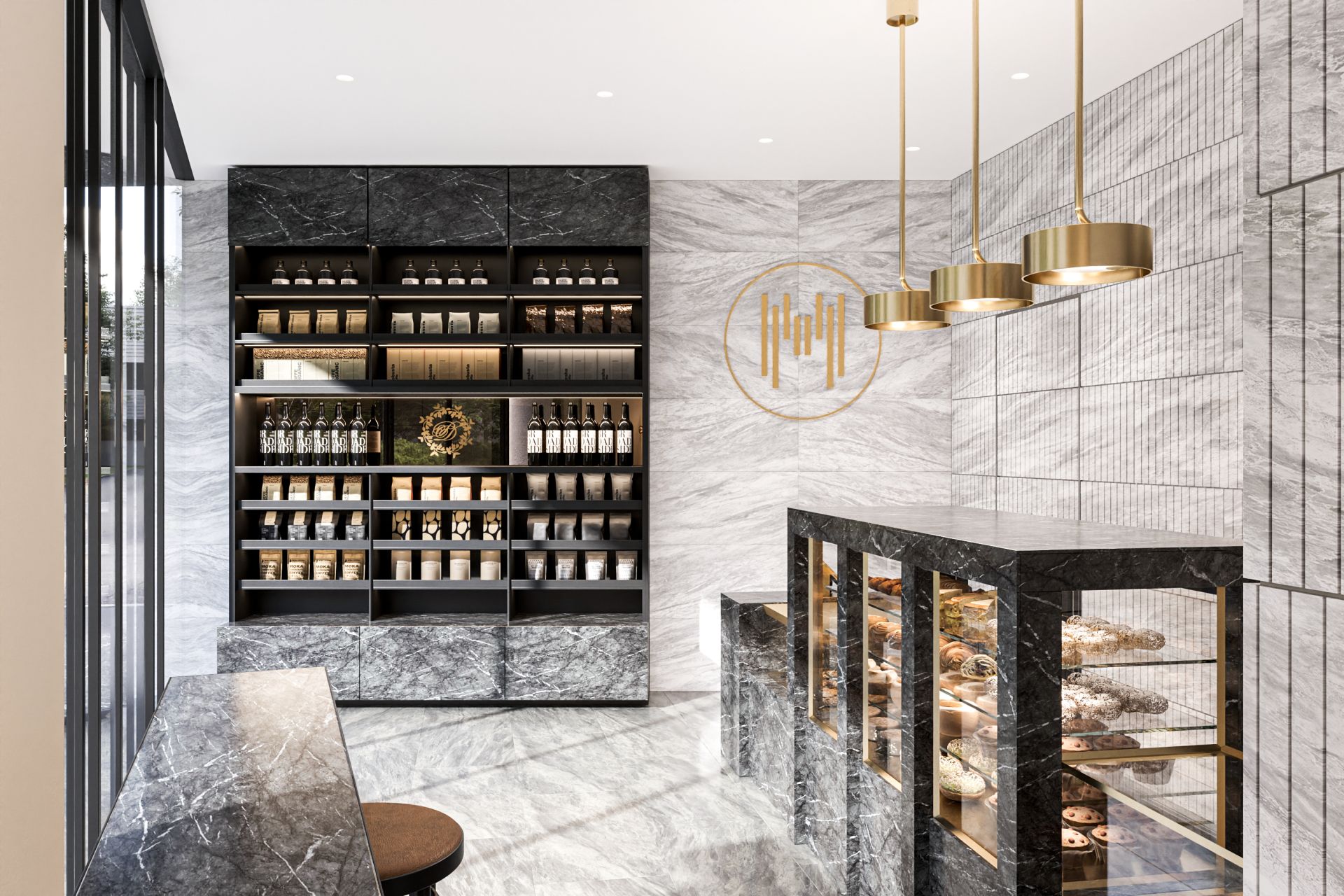 At the heart of the bakery is a custom-designed marble counter, clad in dark marble ceramics with brass detailing. This centerpiece achieves a perfect balance of elegance and practicality, featuring an integrated cooling display that preserves the sleek aesthetic while showcasing fresh goods. Above, bespoke brass lighting fixtures, crafted exclusively for this project, cast a warm glow, highlighting the textures and products throughout the space. Along one wall, a sophisticated display cabinet showcases Dimnik Estate’s wines and olive oils, merging functionality with refined presentation.
