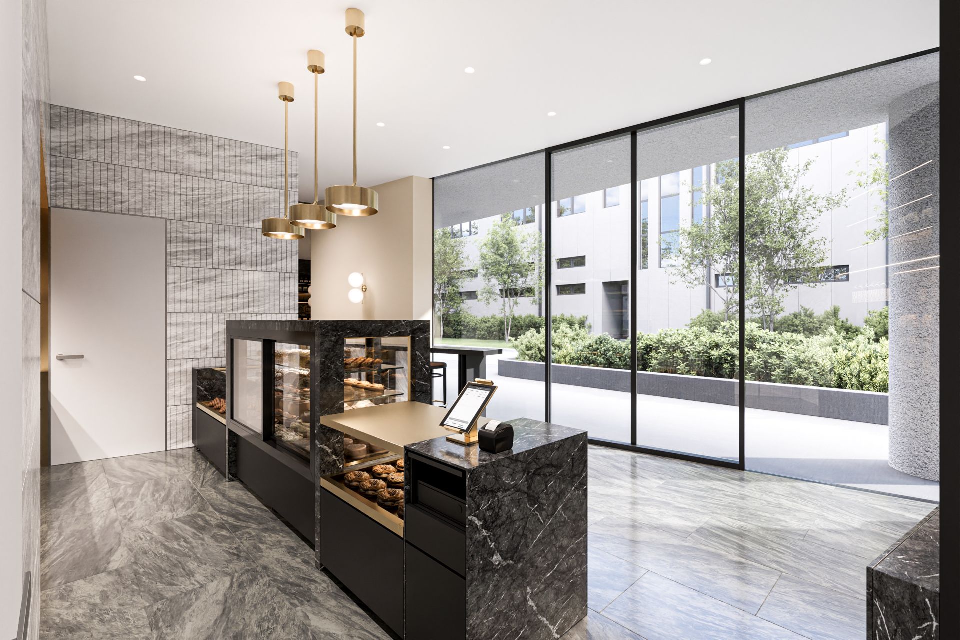 A high-seating area with classic Thonet stools and a marble counter invites guests to enjoy a coffee-to-go, encouraging both quick visits and lingering moments. Every detail, from custom furnishings to the careful selection of materials, was thoughtfully curated to transform this intimate space into an architectural statement—blending the essence of a traditional bakery with the sophistication of a boutique store.